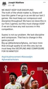 Suarez is not our problem. We lack discipline and composure. That has to change in this game, period! “Big up, @blackstarsofghana, we have more than enough talent to win this one, but we must maintain our focus and discipline for 90 minutes!”